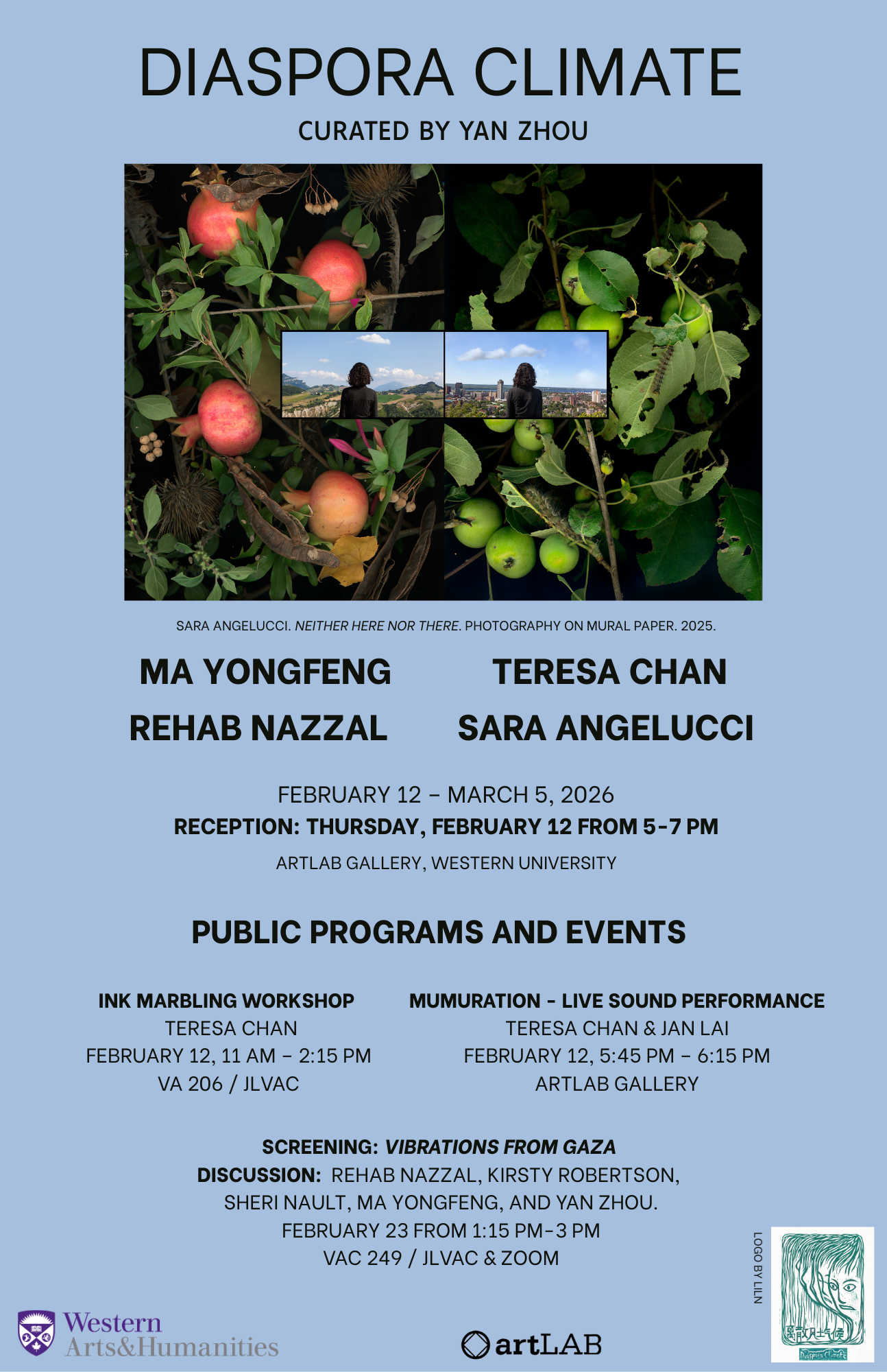 Diaspora Climate is an exhibition curated by Yan Zhou, 2025–26 Curator-in-Residence in Social and Environmental Justice with the Arts in the Department of Visual Arts at Western University. The exhibition will run from February 12 to March 5, 2026, at the Artlab Gallery.